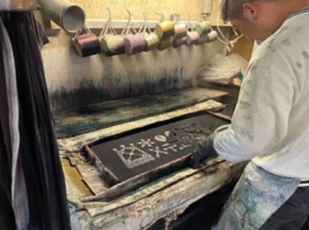 図案を確認しながら慎重に防染糊で土手どてを作り、土手からはみ出ないように染料を注いで生地の表と裏を2度染色します。
