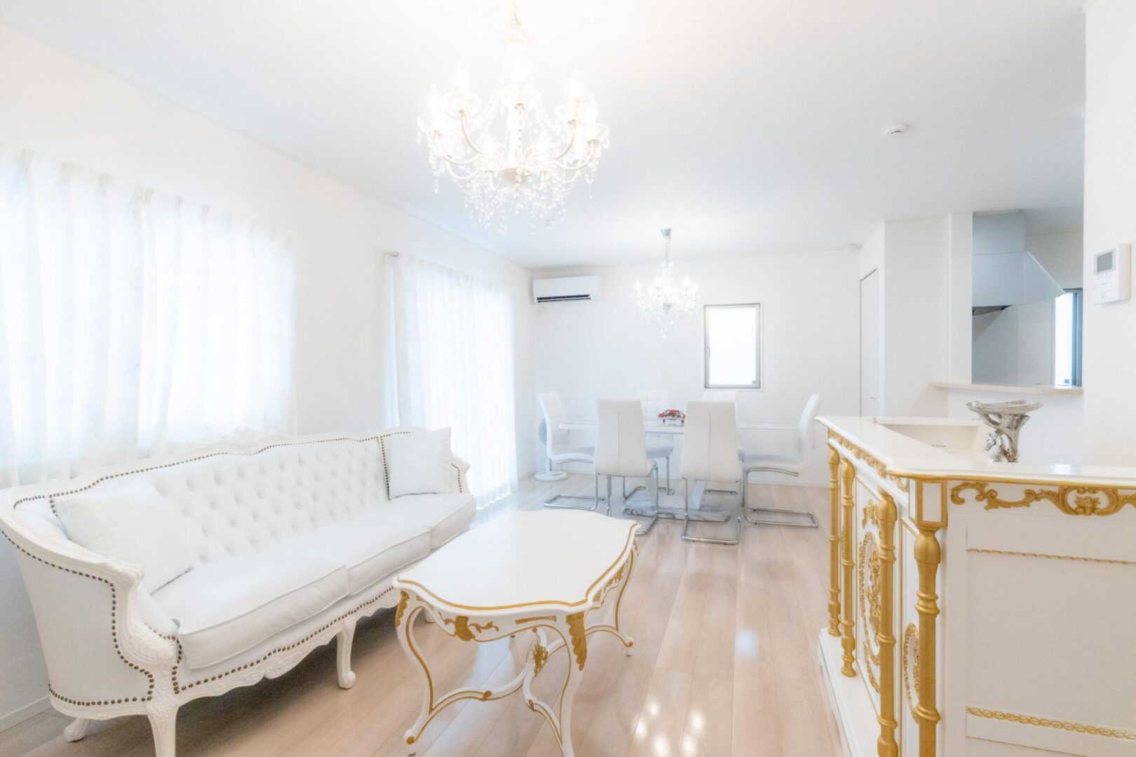 シャンデリアや白を基調としたゴージャスなサロン内で撮影