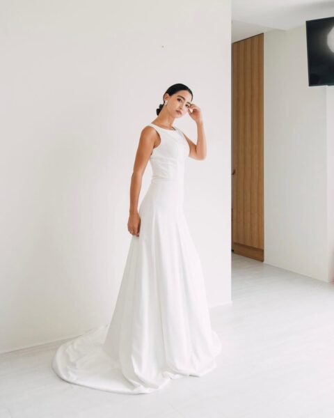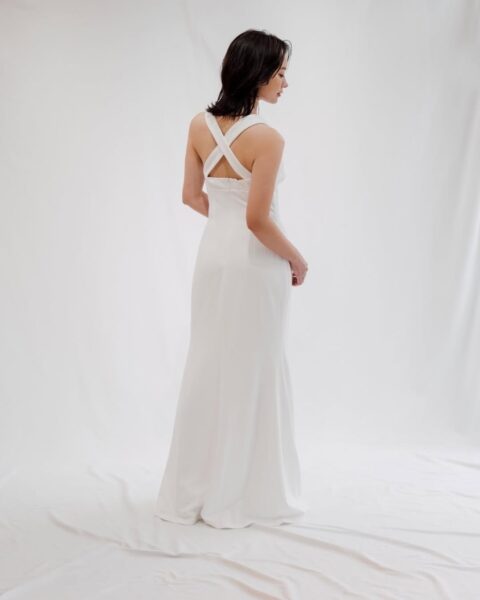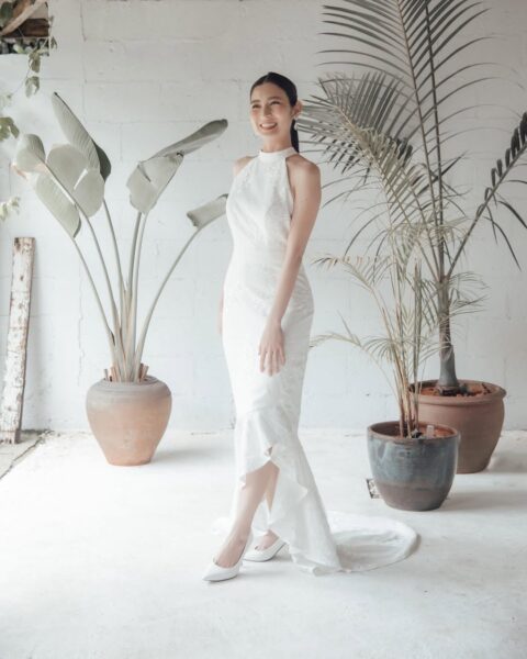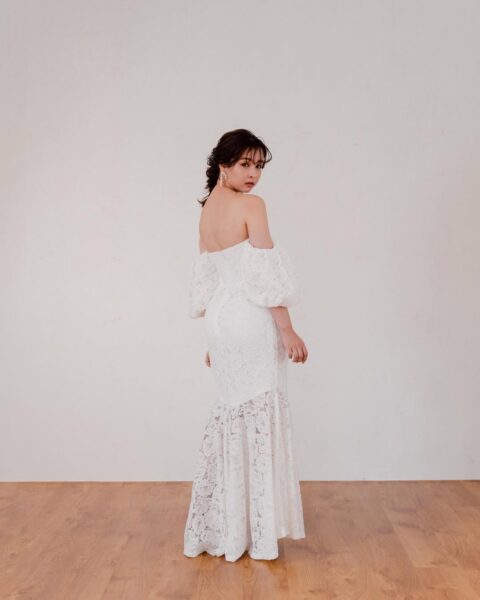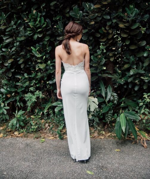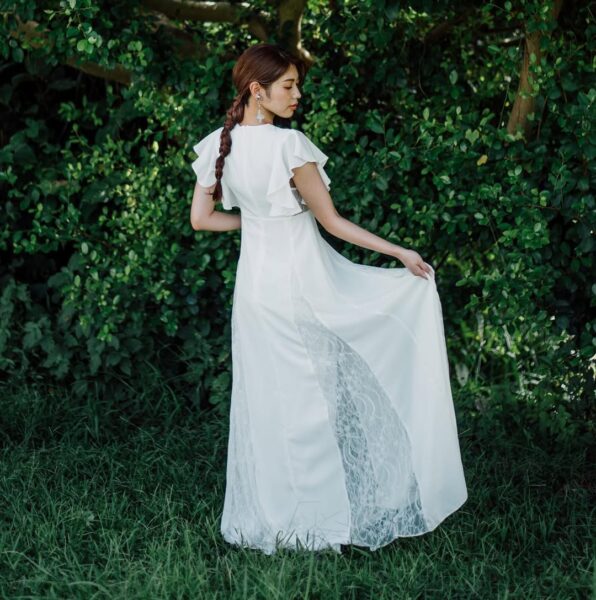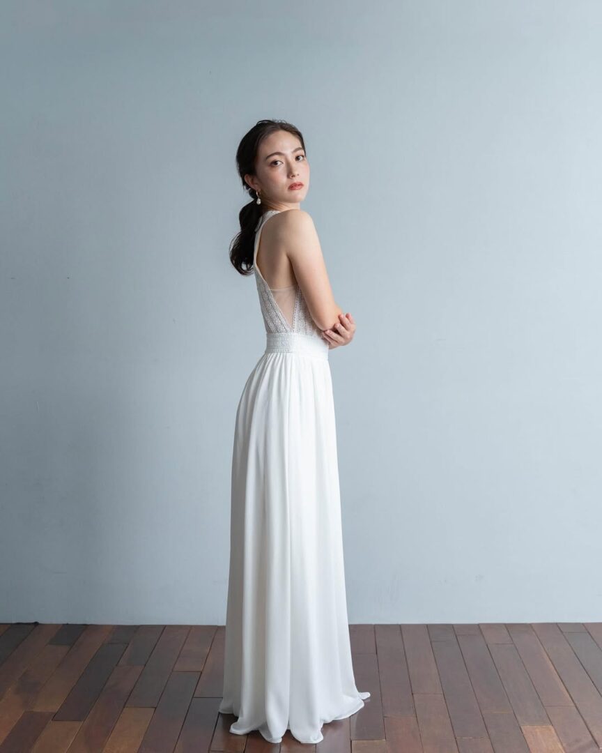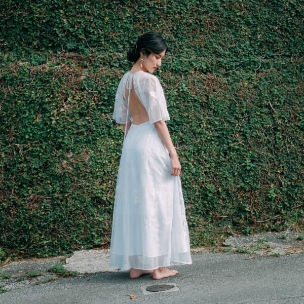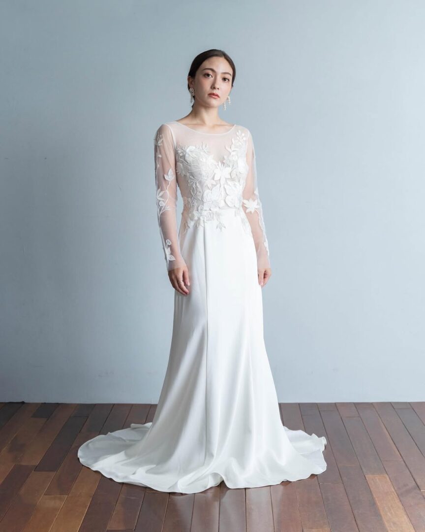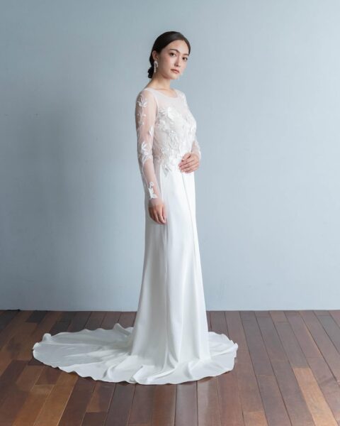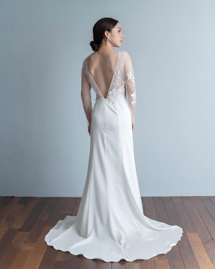 上半身は白とベージュの大柄なフラワー刺繍があしらわれている大人っぽい印象のドレス。袖の丈も長めで胸元の開きもありませんが、背中は腰までV字にカットされているので、バランスのよい上品さを感じます✨