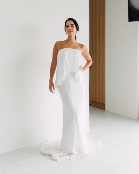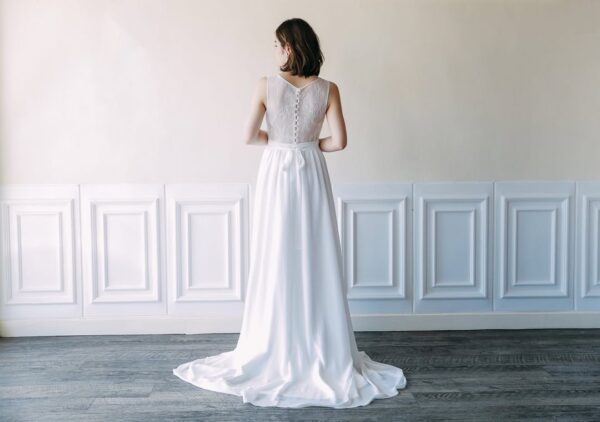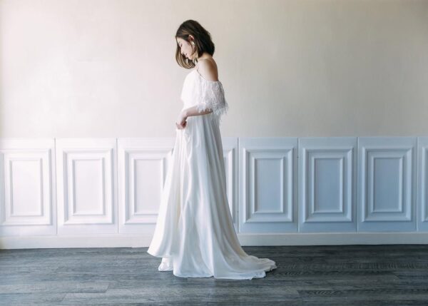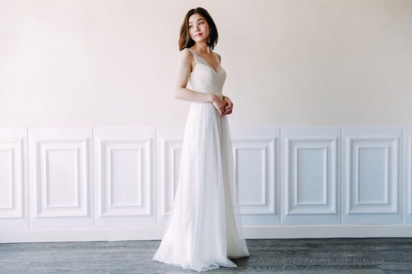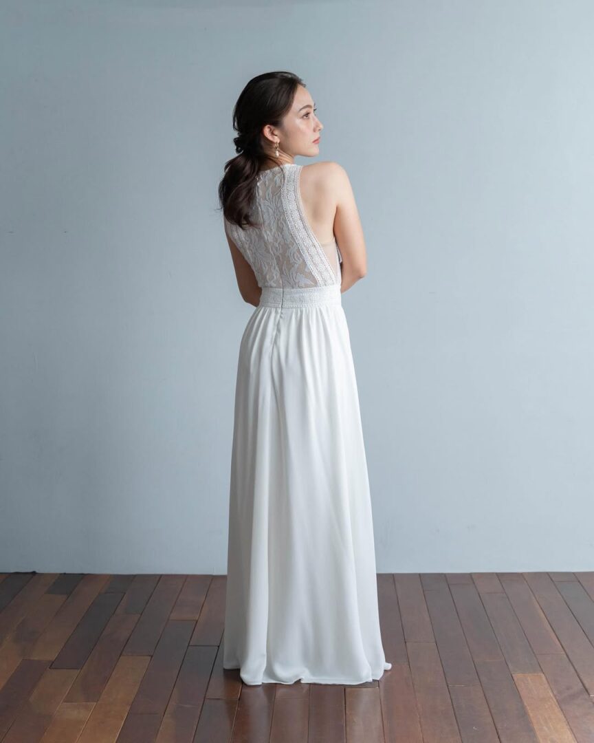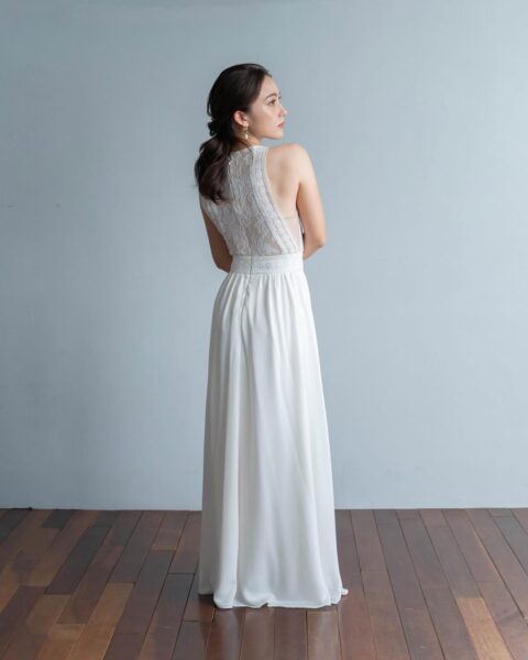 上半身はベージュピンクの裏地に白のレースがあしらわれたタイトなデザイン。スカート部分はやわらかなシフォン素材でサラッと軽やかな印象です。露出少なめなので、胸元や背中の露出に抵抗がある方にもおすすめです。
